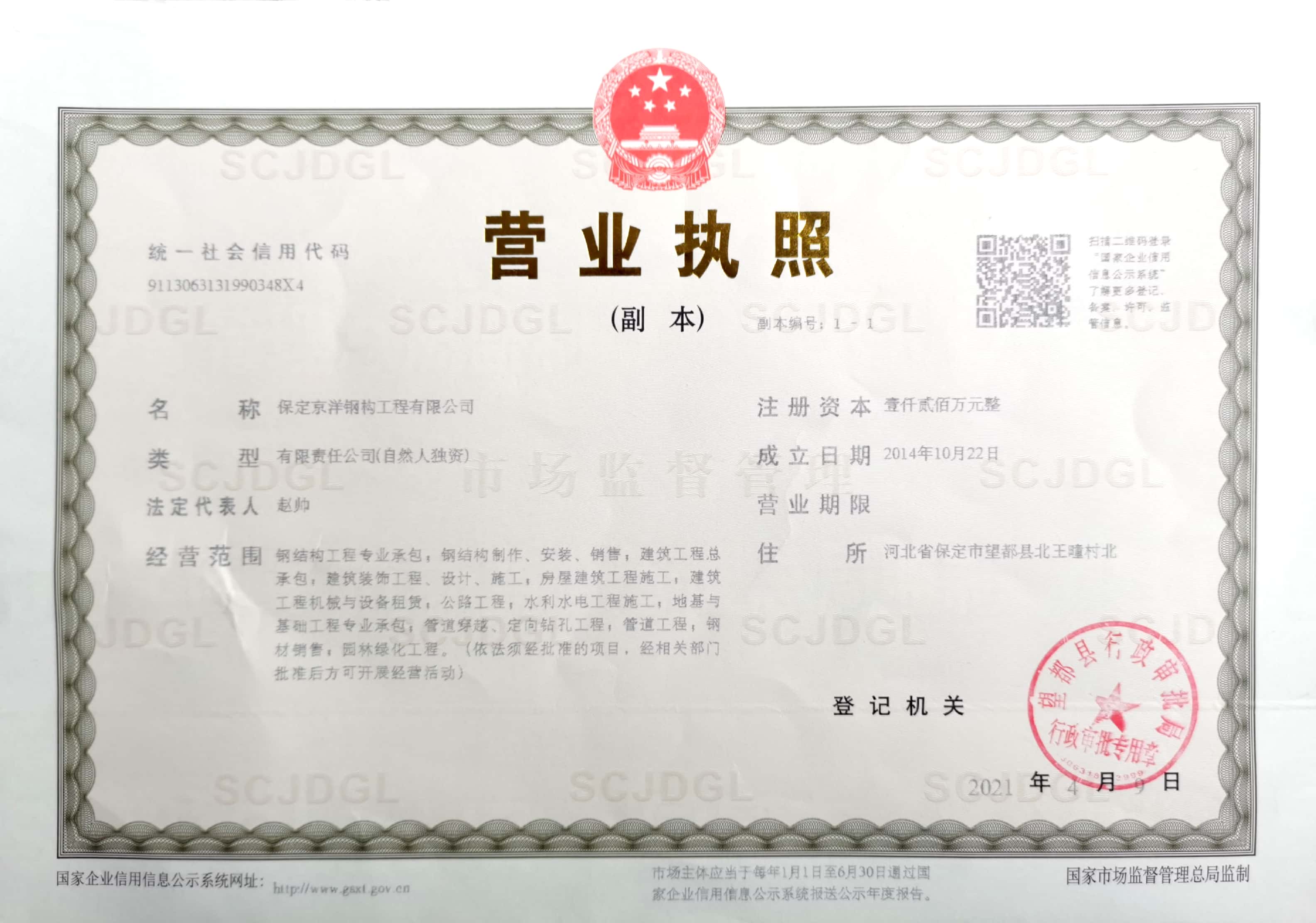 保定京洋鋼構(gòu)工程有限公司位于千年古縣望都。望都縣處于京津冀核心區(qū),是對接京津的交通要塞。距北京180公里,天津170公里,石家莊機(jī)場70公里。京石高鐵、京廣鐵路、京港澳高速、107國道四條交通大動(dòng)脈縱貫全縣。圍繞望都南北各一座高鐵站,定州站(30公里)和保定站(35公里)。京昆高速、保阜高速均有連接線,四條省級公路縱橫交錯(cuò),交通便捷。